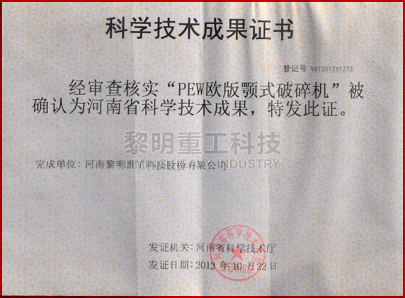 - PEW歐版顎式破碎機獲河南省科學技術成果 >>查看證書