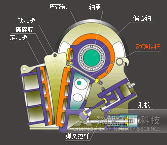 顎式破碎機(jī)主要由機(jī)架、偏心軸、大皮帶輪、飛輪、側(cè)護(hù)板、肘板、肘板后座、調(diào)隙螺桿、復(fù)位彈簧、固定顎板與活動顎板等組成,其中肘板還起到保險作用。