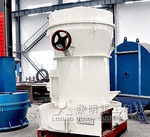 大塊狀物料經(jīng)顎式破碎機(jī)破碎到所需要粒度后,由提升機(jī)將物料送至儲料斗,再經(jīng)振動給料機(jī)均勻定量連續(xù)地送入主機(jī)磨室內(nèi)進(jìn)行研磨。粉磨后的粉子被風(fēng)機(jī)氣流帶走,經(jīng)分析機(jī)分級,符合細(xì)度的粉子隨氣流經(jīng)管道進(jìn)入大旋風(fēng)收集器內(nèi),進(jìn)行分離收集,再經(jīng)粉管排出成品粉子。