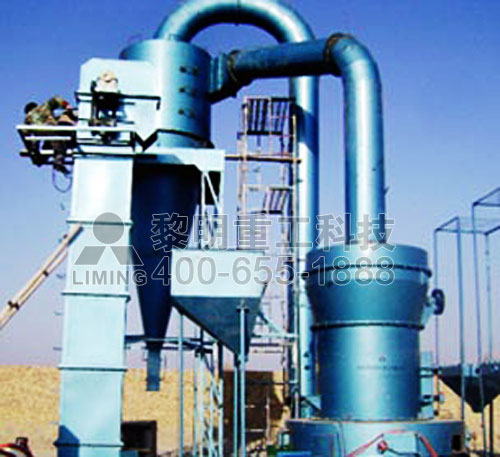 大塊狀物料經(jīng)顎式破碎機破碎到所需要粒度后,由提升機將物料送至儲料斗,再經(jīng)振動給料機均勻定量連續(xù)地送入主機磨室內(nèi)進行研磨。粉磨后的粉子被風機氣流帶走,經(jīng)分析機分級,符合細度的粉子隨氣流經(jīng)管道進入大旋風收集器內(nèi),進行分離收集,再經(jīng)粉管排出成品粉子。