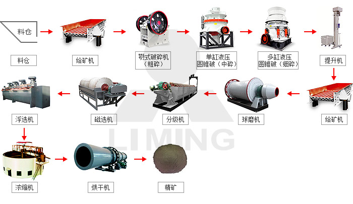 選礦生產(chǎn)線一般分為磁選法和浮選法兩種不同的選取作業(yè)方式,具體流程如下:給礦機(jī)將開(kāi)采的礦石送入顎式破碎機(jī)進(jìn)行初步破碎,粗破后的礦石由圓錐破碎機(jī)破碎至合理細(xì)度后經(jīng)由提升機(jī)、給礦機(jī)均勻送入球磨機(jī)進(jìn)行粉碎、研磨。研磨出的礦石進(jìn)入分級(jí)機(jī)內(nèi),分級(jí)機(jī)借助固體顆粒比重不同在液體中沉淀速度不同的原理,對(duì)礦石混合物進(jìn)行洗凈、分級(jí)。經(jīng)過(guò)洗凈和分級(jí)的礦物混合料在經(jīng)過(guò)磁選機(jī)時(shí),由于各種礦物的比磁化系數(shù)不同,經(jīng)由磁力和機(jī)械力將混合料中的磁性物質(zhì)分離開(kāi)來(lái)。經(jīng)過(guò)磁選機(jī)初步分離后的礦物顆粒再被送入浮選機(jī),根據(jù)不同的礦物特性加入不同的藥物,使得所要的礦物質(zhì)與其他物質(zhì)分離開(kāi)。在所要的礦物質(zhì)被分離出來(lái)后,因其含有大量水分,須經(jīng)濃縮機(jī)的初步濃縮,再經(jīng)烘干機(jī)烘干,即可得到干燥的礦物質(zhì)。