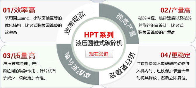 3、HPT圓錐破對(duì)腔型和沖程進(jìn)行了重新實(shí)驗(yàn)設(shè)計(jì),更適合破碎河卵石、玄武巖、鐵礦石等堅(jiān)硬物料,產(chǎn)量比普通彈簧圓錐破提高。