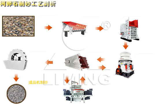合理的河卵石制砂工藝,在考慮破碎項目投資成本的同時,也不能忽略生產(chǎn)線的生產(chǎn)成本。考慮到河卵石的高硬度必然對顎板、板錘、反擊板等耐磨件造成高損耗,因而在工藝設(shè)計上,我們推薦選用層壓原理的破碎設(shè)備,以降低耐磨件的損耗。典型的層壓設(shè)備配置是兩級顎破或顎破加圓錐破。如果客戶對石料粒型有較高的要求,我們建議配置一臺制砂機進行整形破碎,這樣就形成了三段破碎的工藝配置。三段破碎必然導(dǎo)致項目的投資成本升高,但對于長期運營的制 砂廠來說,三段破碎對生產(chǎn)成本的降低是十分可觀的。