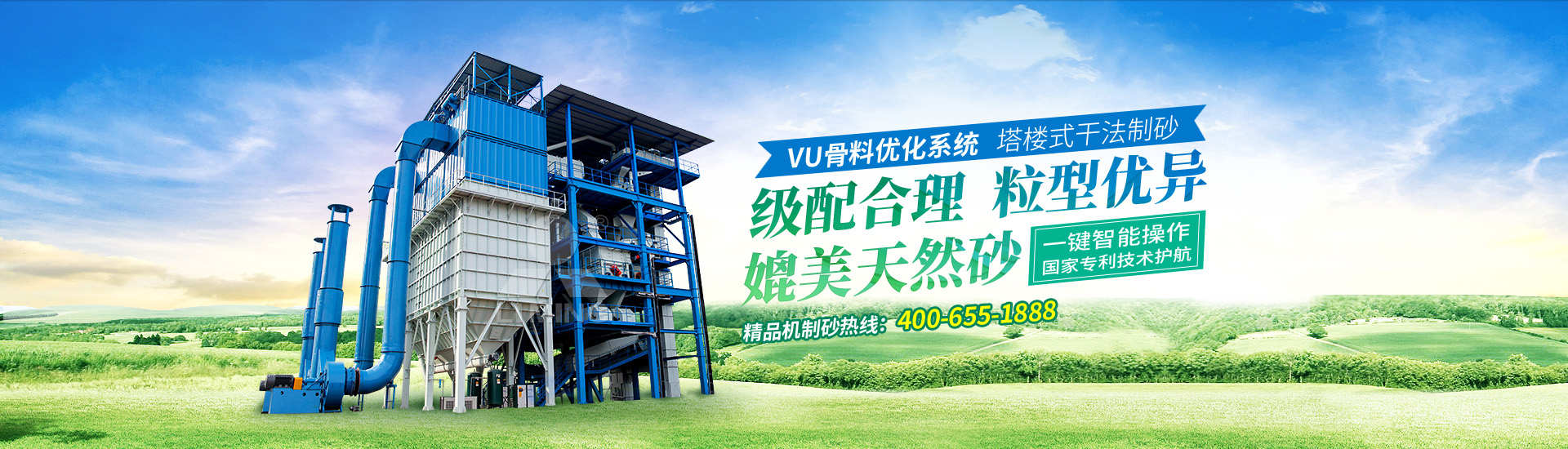 斗提機(jī)將原料輸送至頂樓,由輸送皮帶送入VU沖擊破,經(jīng)高頻石打石研磨后進(jìn)入??睾Y,分選后篩上料返回VU沖擊破再加工,篩下料進(jìn)入VU粒優(yōu)機(jī)整形成準(zhǔn)成品砂,同時通過脈沖式除塵器的風(fēng)選控制石粉量。最后準(zhǔn)成品砂通過加濕攪拌機(jī)均勻拌合后即為成品機(jī)制砂,石粉則被統(tǒng)一儲存在粉礦倉中。