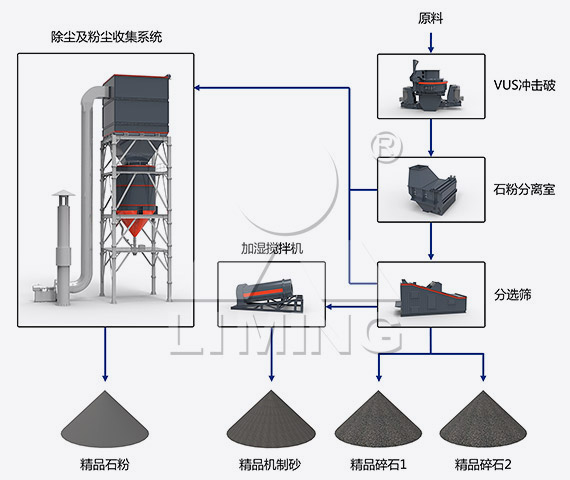 原料通過斗提機被送入頂樓,由原料輸送皮帶將0~40mm的碎石送入VUS沖擊破,經(jīng)過高頻石打石研磨后進入石粉分離室,通過調整控粉箱進風口大小和系統(tǒng)風量來調節(jié)制砂含粉量;處理后的物料進入分選篩內分選出精品碎石、石粉及準成品砂。其中石粉通過除塵及粉塵收集系統(tǒng)處理后收集為精品石粉,準成品砂通過加濕攪拌機均勻拌合后即為精品機制砂。 經(jīng)VUS砂石同出系統(tǒng)處理后,能夠產(chǎn)出級配合理、粒型圓潤、含粉量可控的精品粗細骨料(碎石、機制砂),以及干燥潔凈、可進行統(tǒng)一回收利用的高附加值石粉(根據(jù)原料決定可應用范圍)。
