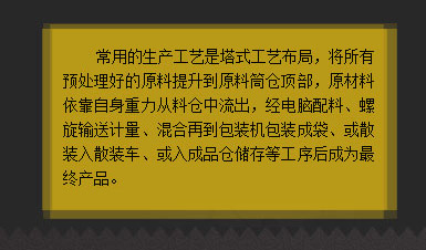 常用的生產(chǎn)工藝是塔式工藝布局,將所有預(yù)處理好的原料提升到原料筒倉(cāng)頂部,原材料依靠自身重力從料倉(cāng)中流出,經(jīng)電腦配料、螺旋輸送計(jì)量、混合再到包裝機(jī)包裝成袋、或散裝入散裝車(chē)、或入成品倉(cāng)儲(chǔ)存等工序后成為產(chǎn)品。