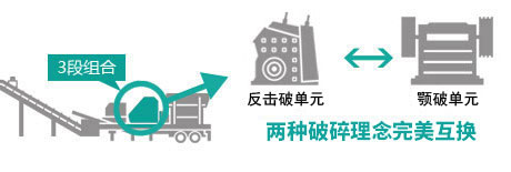 三組合移動站一種車身為8種機型通用,喂料單元互換系統(tǒng)、破碎單元互換系統(tǒng)和篩分單元互換系統(tǒng),只需再投資單機設(shè)備成本,短時間內(nèi),即可在同一車身上實現(xiàn)不同型號喂料單元、破碎單元和篩分單元互換系統(tǒng),整機各系統(tǒng)之間的準確匹配,適應(yīng)場合更廣泛,破碎功能更優(yōu)良,客戶的消費品得到增值。